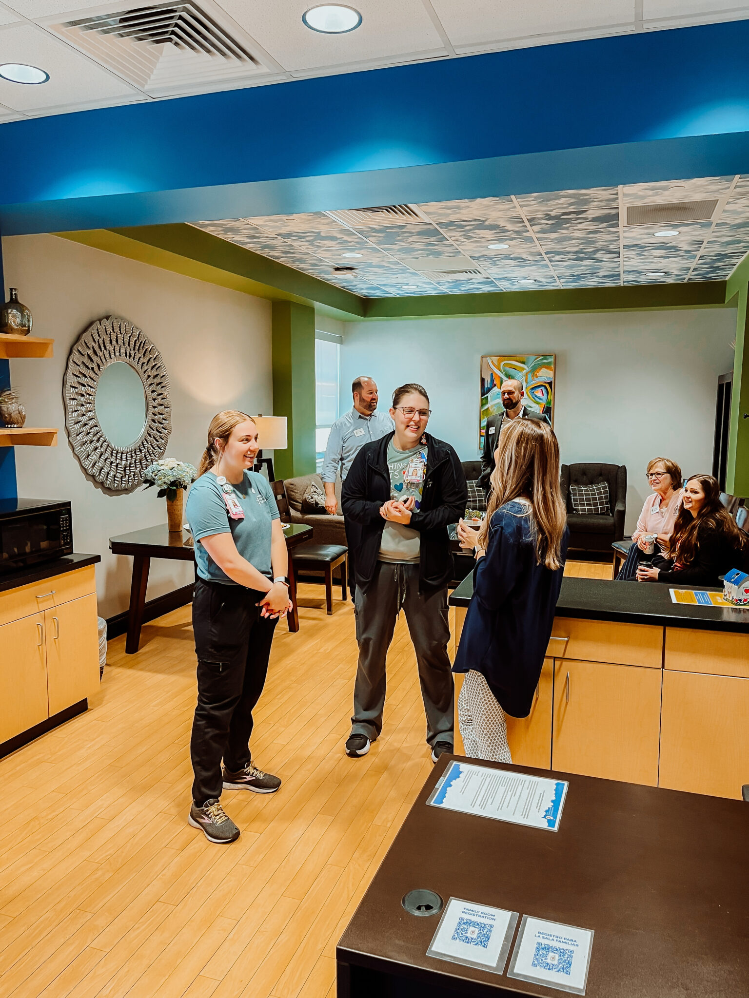 Our Family Room is located on the 5th floor at Wesley Children's Hospital. It is a place of respite just steps away from your child's hospital bed. In the Family Room, families will find a comfortable place to relax, food, personal care items, laundry facilities, and a TV. There is no fee to visit the Family Room.